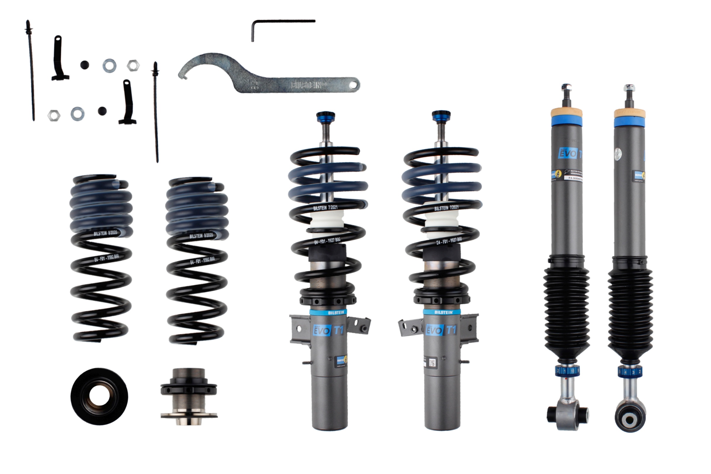 Bilstein EVO T1 Adjustable Coilover Suspension Kit for 2020–Present Toyota Supra (A90). Multi‑stage damping with height adjustability (F: 20–30 mm, R: 10–35 mm). EDC delete module required for proper fitment.