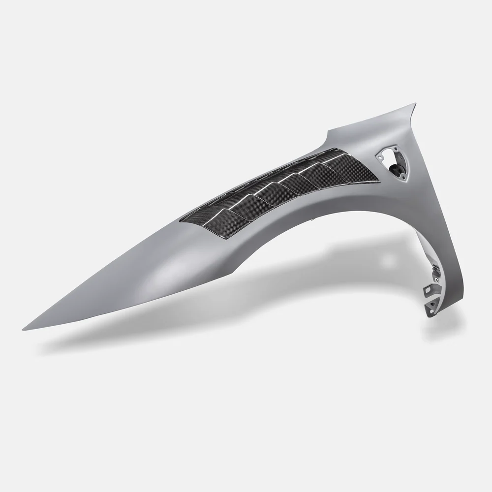 Each fender is meticulously fabricated from 1×1 carbon fiber weave, providing lightweight strength and rigidity that reduces unsprung weight while showcasing an aggressive, high-performance look. The integrated vents not only add to the dynamic styling but help enhance airflow and cooling around the front wheel arches. With a seamless, body-matched fit, these vented fenders make a bold statement at car shows, photoshoots, or spirited weekend drives.