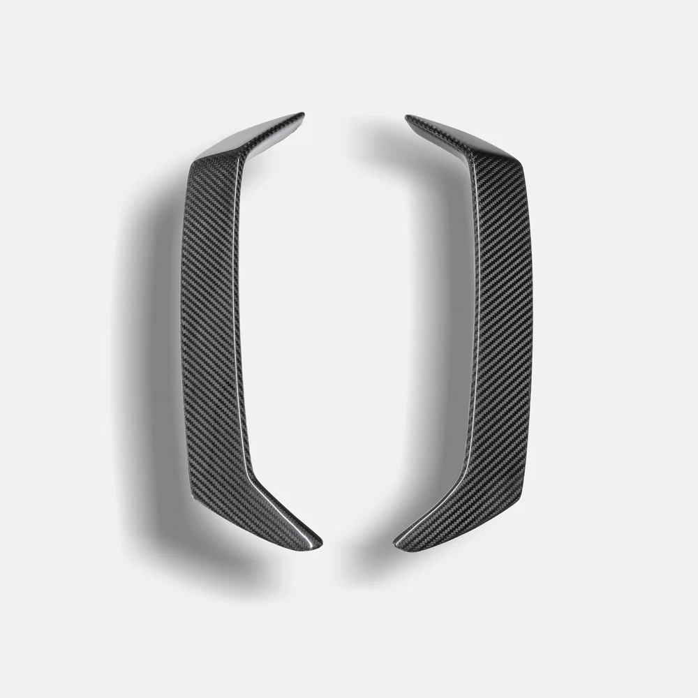 The precision-molded design integrates seamlessly with OEM bumper contours, maintaining factory-level fitment and alignment. These vertical accents create a more aggressive front-end profile and pair perfectly with other carbon fiber components such as front lips, splitters, and center chins.