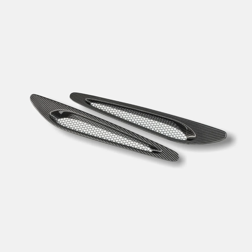 These hood vents are crafted from high-quality 2×2 twill weave carbon fiber and finished with a UV-resistant clear coat to maintain their rich texture and deep gloss under sunlight. The vents improve heat extraction from the engine bay and promote better airflow, helping to reduce under-hood temperatures during spirited driving or track use.